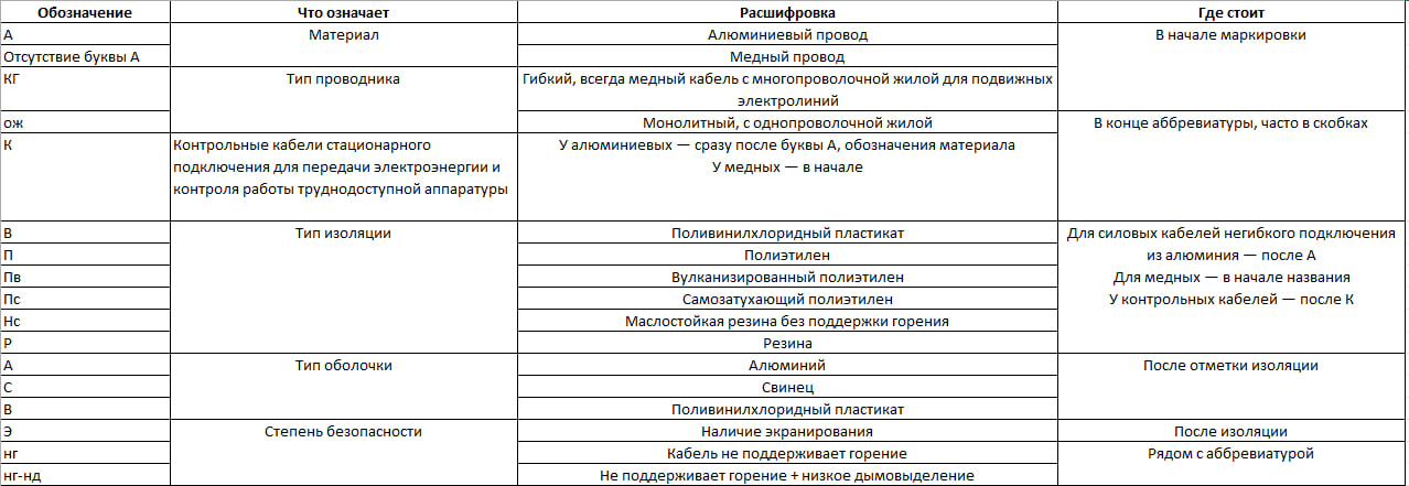 Все потому, что алюминий и медь во многом отличаются. Первый легче и дешевле, у него меньше проводимость и быстрая окисляемость на воздухе. Материал изготовления определяют по буквенным обозначениям. Таблица расшифровки маркировки кабелей и проводов выглядит так: